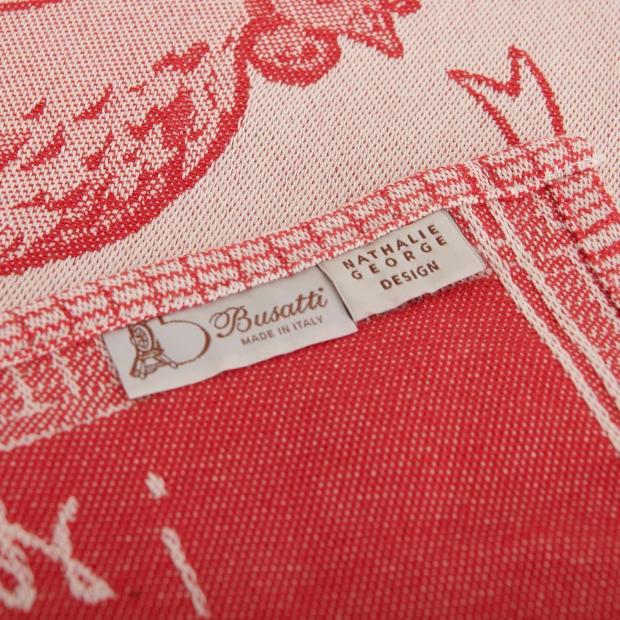 La collection textile de la marque Busatti, création Nathalie George, est en tissage jacquard 100% coton. Deux gammes de couleurs sont proposés l’une noire et naturelle, l’autre rouge et naturelle, composées de trois différents dessins de torchons dont deux d’entre eux sont déclinés sur des sets et des serviettes de table. Une nappe complète l’ensemble.