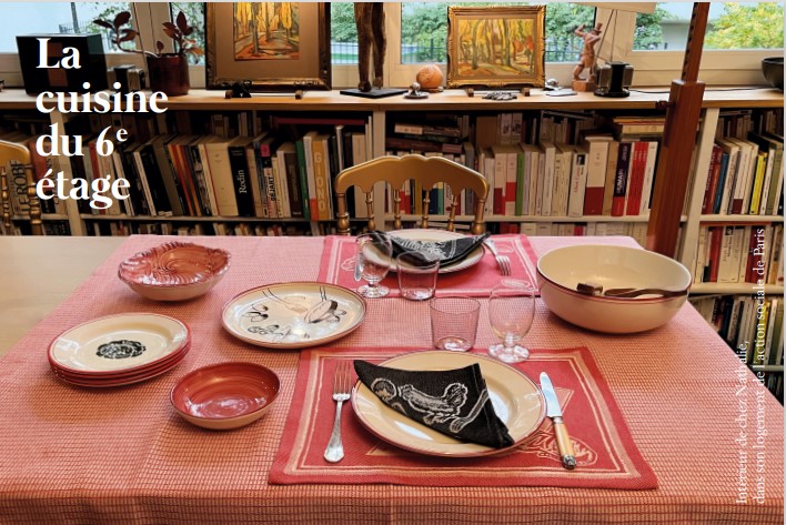 La table du 6ème étage est certes simple mais élégante. Tout comme bien manger avec peu est possible. Ainsi nappe, sets et torchons s’avèrent indispensables, tout comme assiettes, coupelles et saladier en faïence.