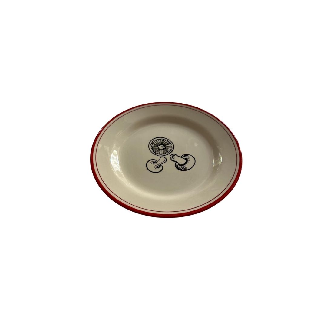 Dècors, filet rouge, contre filet bordeau et dessins : Champignons.