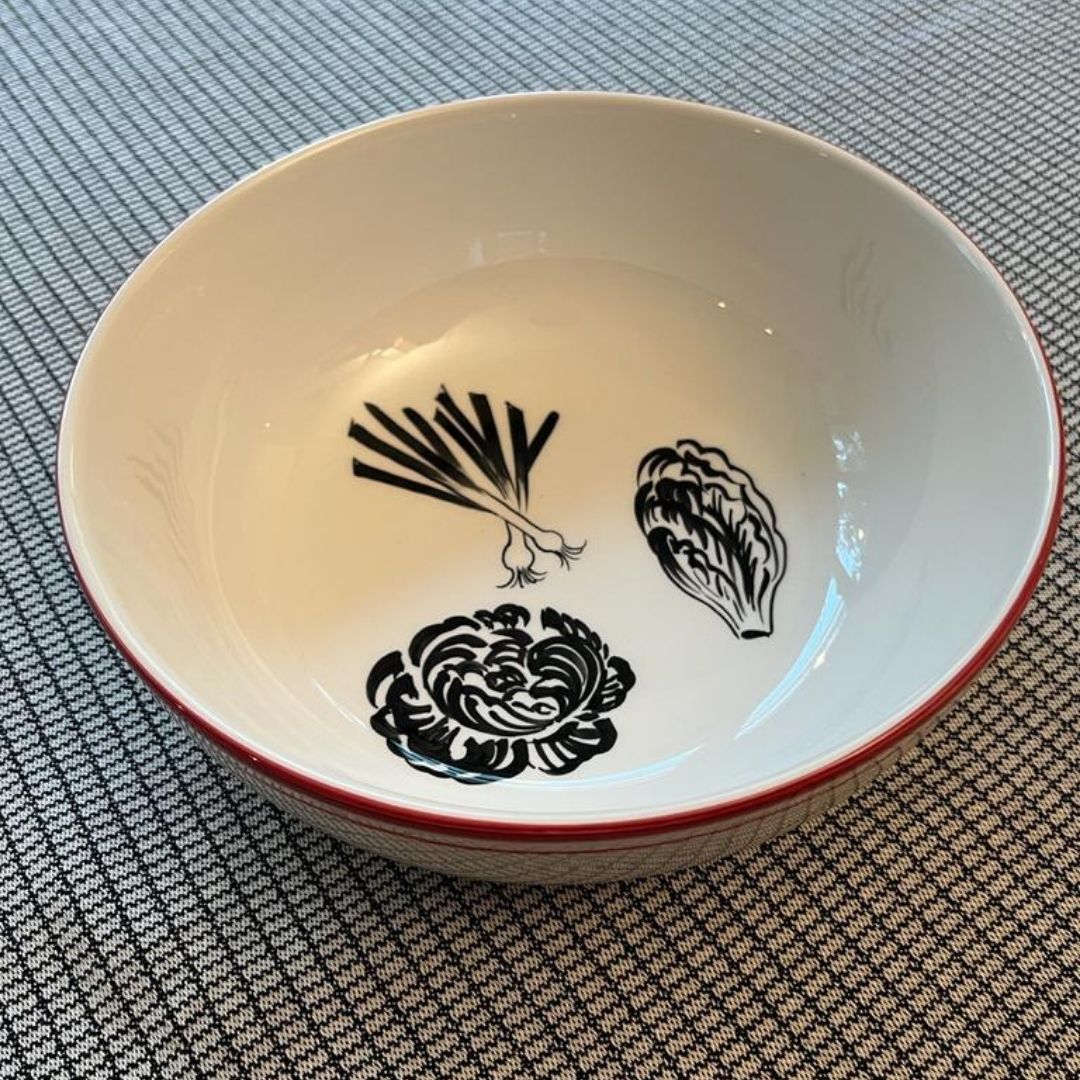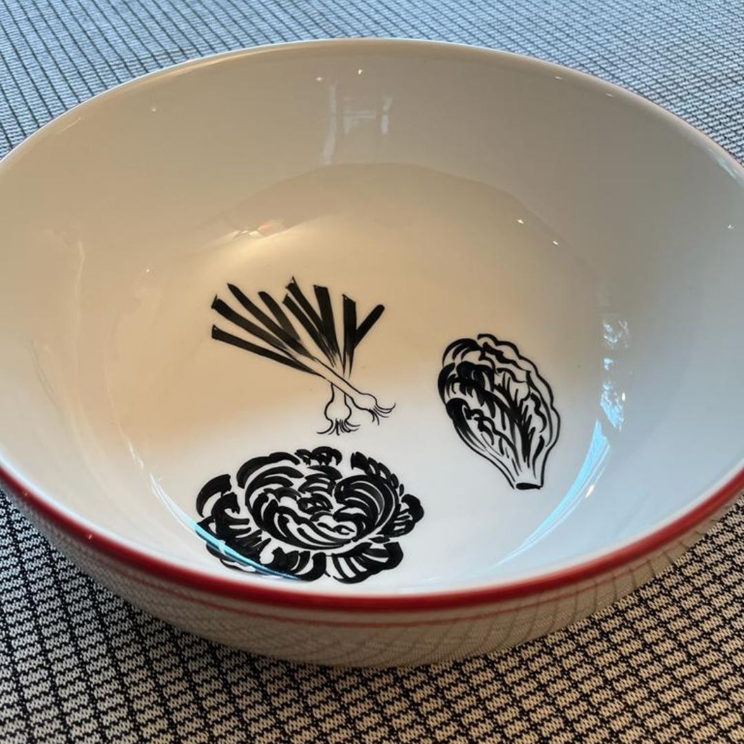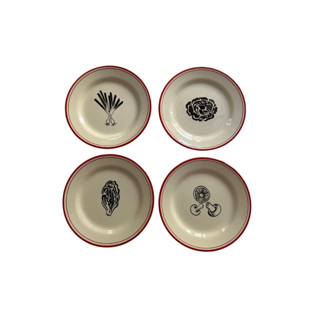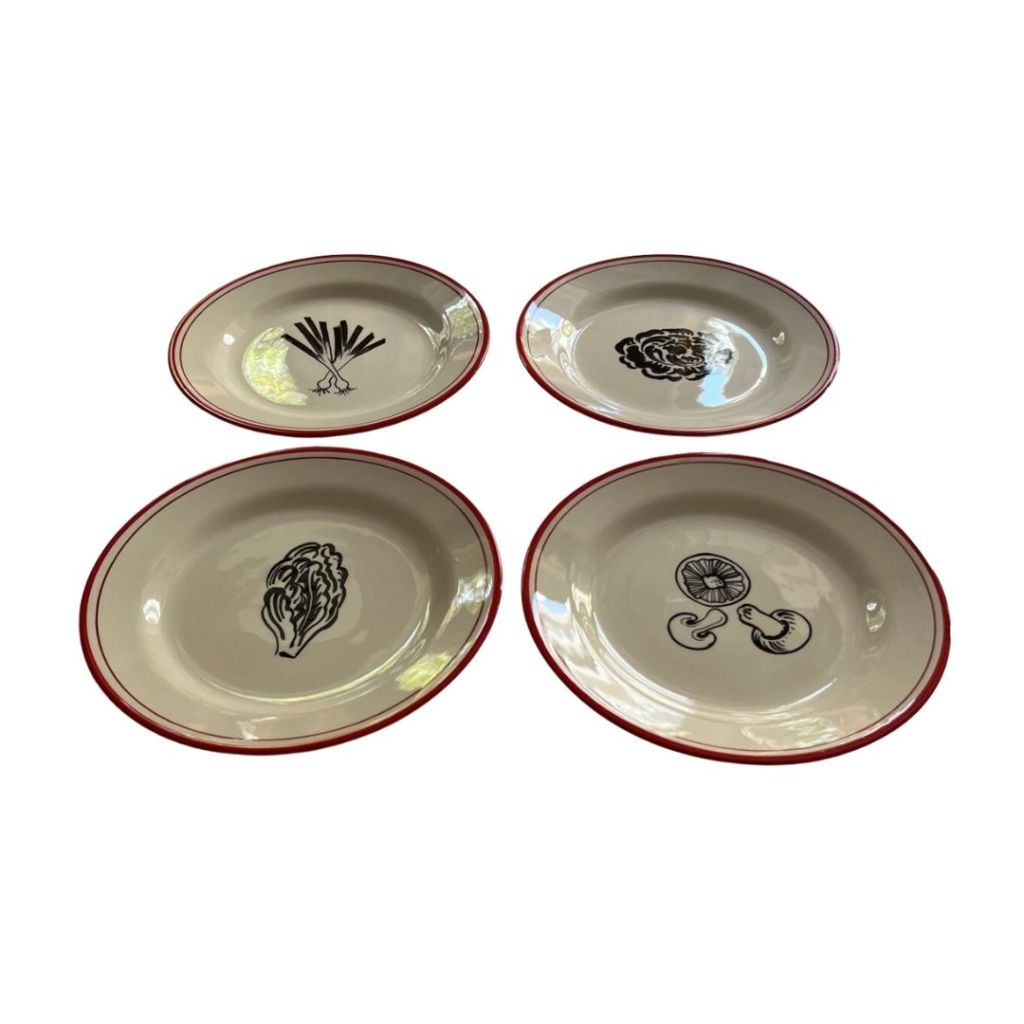 Set de 4 dècors, filet rouge, contre filet bordeau. dessins : Champignons, oignons nouveaux, choux/salade, salade/trévises